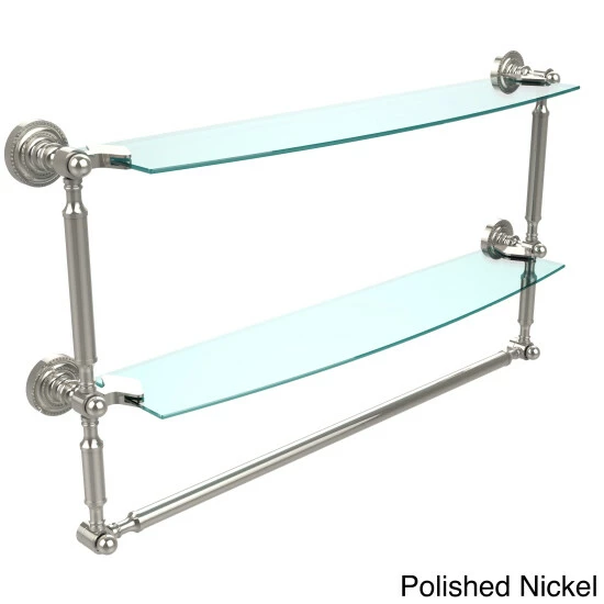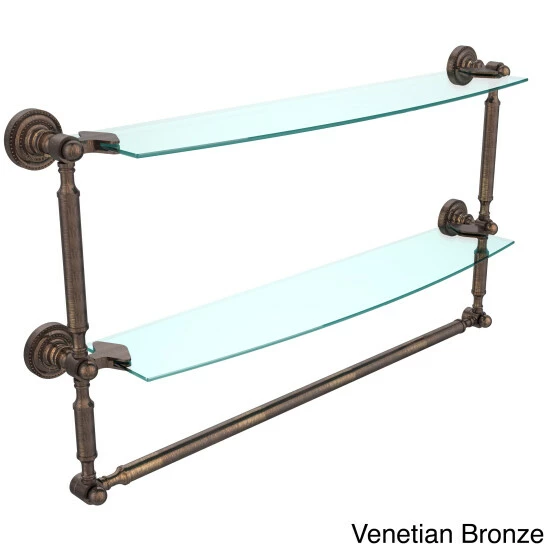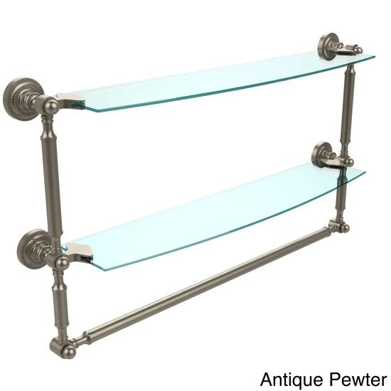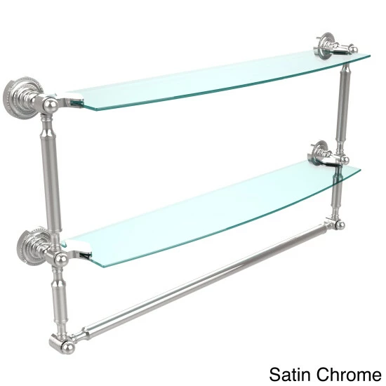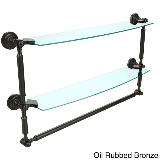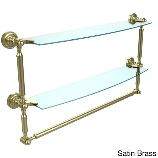 Add space and organization to your bathroom with this simple, contemporary style glass shelf. Featuring tempered, beveled-edged glass and solid brass hardware this shelf is crafted for durability, strength and style. Integrated towel bar provides space for your favorite decorative towels or for your everyday use. One of the many coordinating accessories in the Allied Brass Collection of products, this subtle glass shelf is the perfect complement to your bathroom decor.