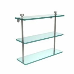 Add space and organization to your bathroom with this simple, contemporary design 3-tier glass vanity shelf. Featuring tempered, beveled-edged glass and solid brass hardware this shelving unit is crafted for durability, strength and style. One of the many coordinating accessories in the allied brass collection of products, this subtle glass shelf unit is the perfect complement to your bathroom decor.