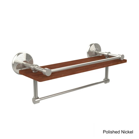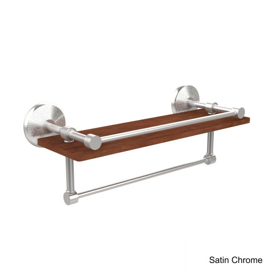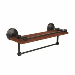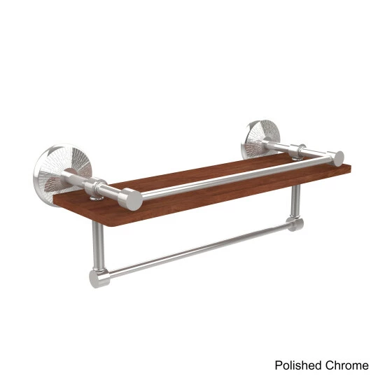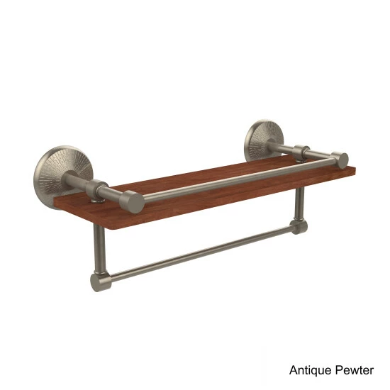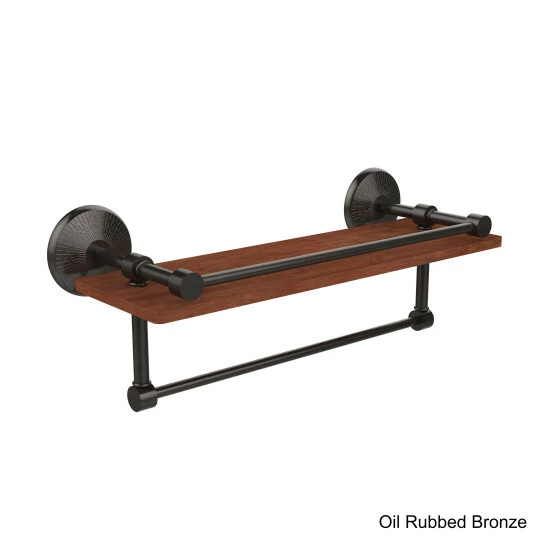 Decorate your bathroom with your favorite smaller pieces on this shelf with a rail to keep your items in place. Featuring a solid brass towel bar, this bathroom fixture lets you utilize the space beneath the shelf.