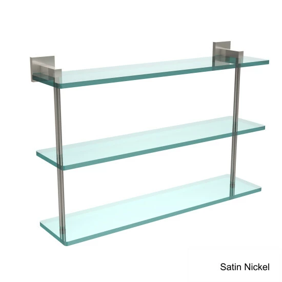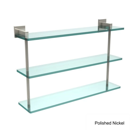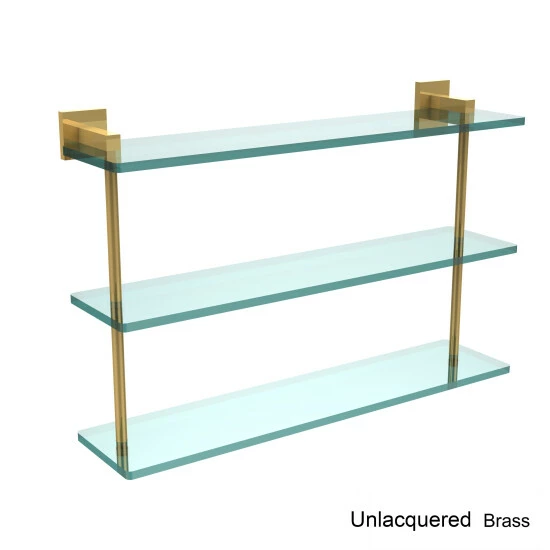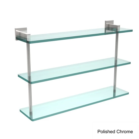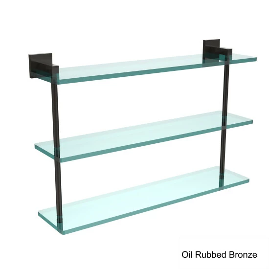 Complete your bathroom needs with this 22-inch triple tiered glass shelf that is available in a range of finishes to easily pair with any existing decor. Add space and organization to your bathroom with this simple, contemporary design 3-tier glass vanity shelf. Featuring tempered, beveled-edged glass and solid brass hardware this shelving unit is crafted for durability, strength and style. One of the many coordinating accessories in the Allied Brass collection of products, this subtle glass shelf unit is the perfect complement to your bathroom decor.