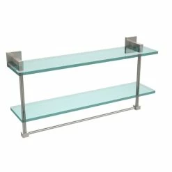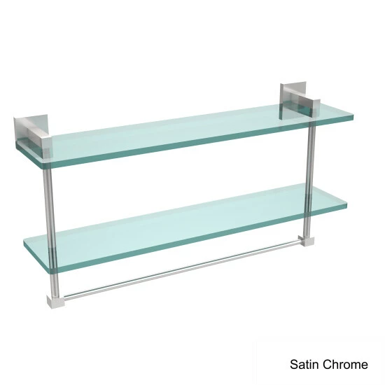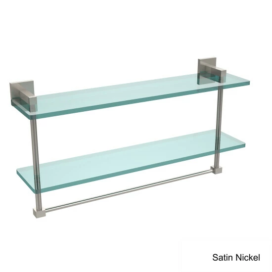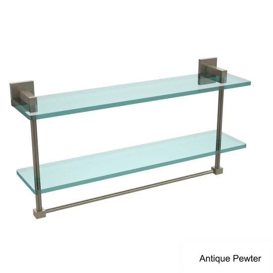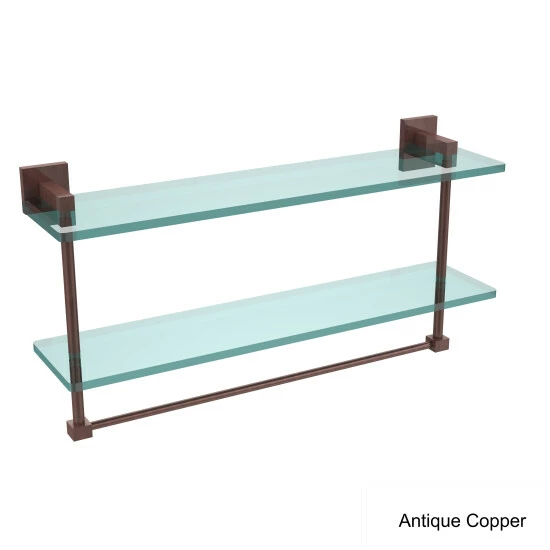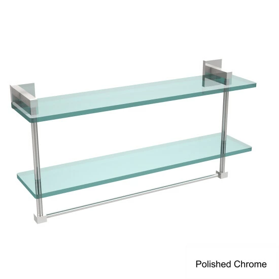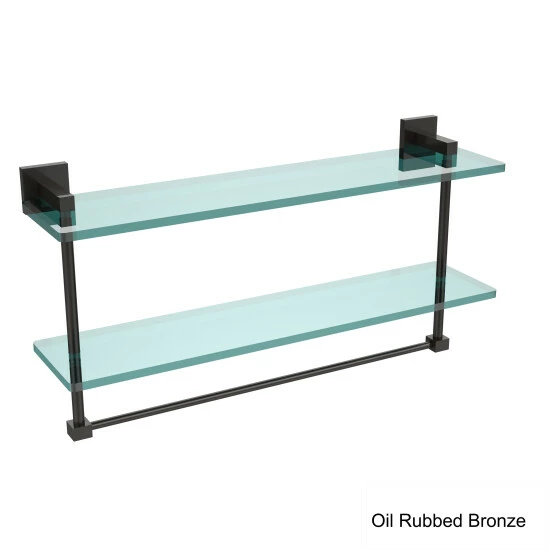 Complete your bathroom needs with this 22-inch two-tiered glass shelf with integrated towel bar that is available in a range of finishes to easily pair with any existing decor. Add space and organization to your bathroom with this simple, contemporary design 2-tier glass vanity shelf. Featuring tempered, beveled-edged glass and solid brass hardware this shelving unit is crafted for durability, strength and style. Integrated towel bar provides space for your favorite decorative towels or for your everyday use. One of the many coordinating accessories in the Allied Brass collection of products, this subtle glass shelf unit is the perfect complement to your bathroom decor.