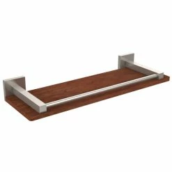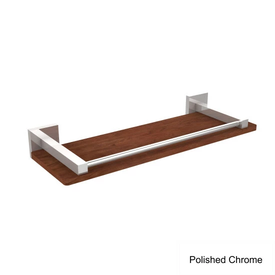 Mount this practical and attractive gallery-rail shelf in your bathroom to hold toiletries or decorative knickknacks. A brass bar prevents items from sliding off the shelf, protecting fragile bottles.