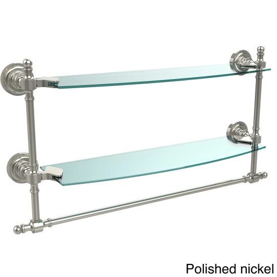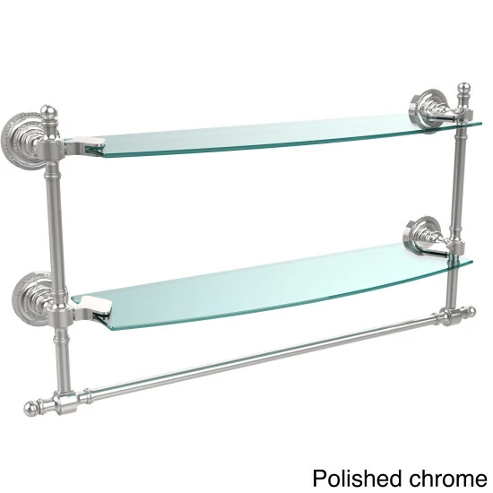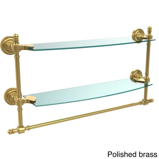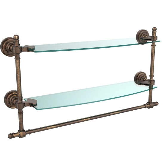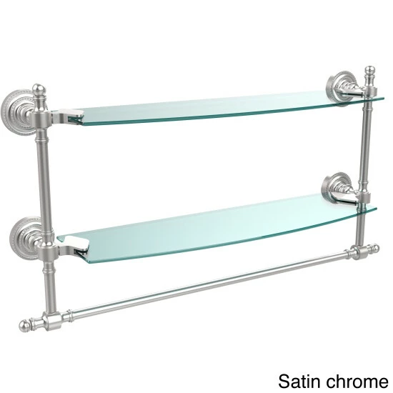 Add space and organization to your bathroom with this simple, contemporary style glass shelf. Featuring tempered, beveled-edged glass and solid brass hardware this shelf is crafted for durability, strength and style. Integrated towel bar provides space for your favorite decorative towels or for your everyday use. One of the many coordinating accessories in the Allied Brass Collection of products, this subtle glass shelf is the perfect complement to your bathroom decor.