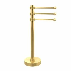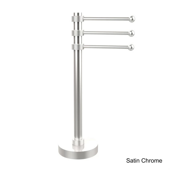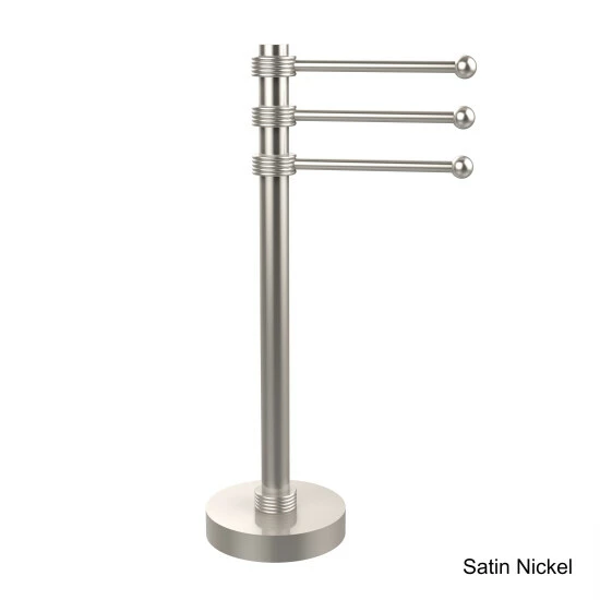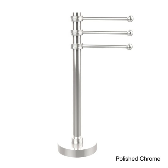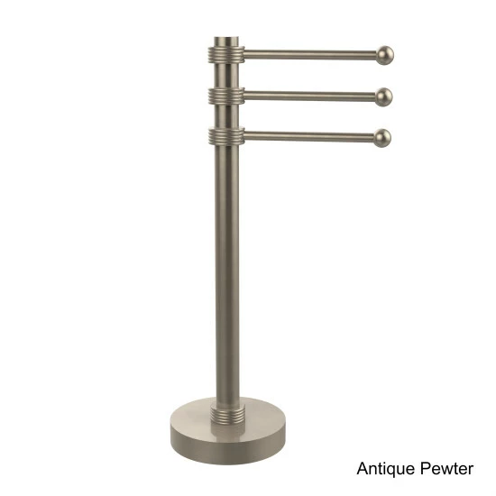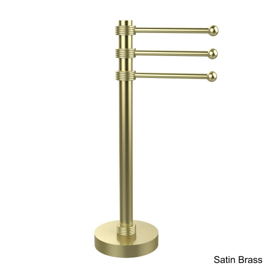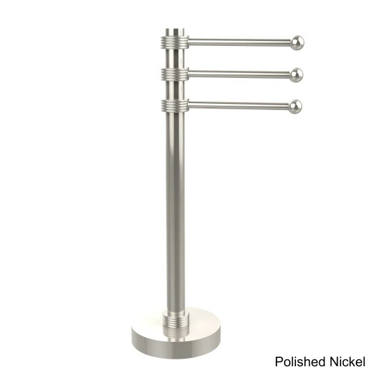 Give a royal feel to your bathroom with this guest towel holder in unlacquered solid brass with groovy accents. Use its three pivoting arms to help guests have easy access to their towels. This towel holder has the ideal size for both your hand towels and washcloths. It also has a heavy base that provides stability to prevent the stand from falling over. Choose from multiple different finishes that are available.