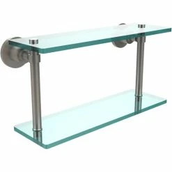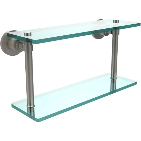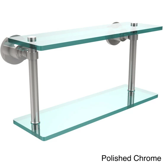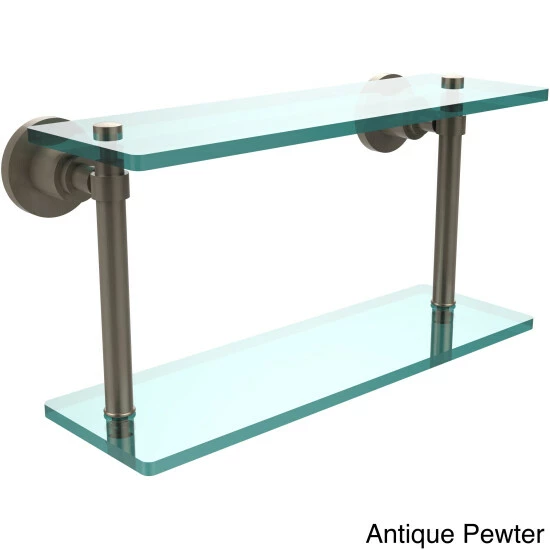Add space and organization to your bathroom with this simple, contemporary design 2-tier glass vanity shelf. Featuring tempered, beveled-edged glass and solid brass hardware this shelving unit is crafted for durability, strength and style. One of the many coordinating accessories in the Allied Brass collection of products, this subtle glass shelf unit is the perfect complement to your bathroom decor.