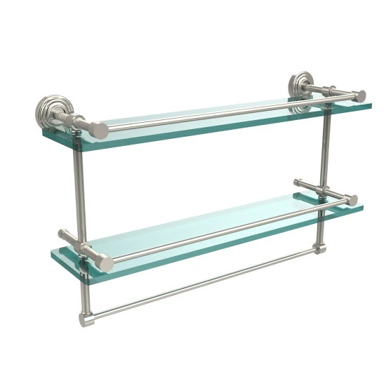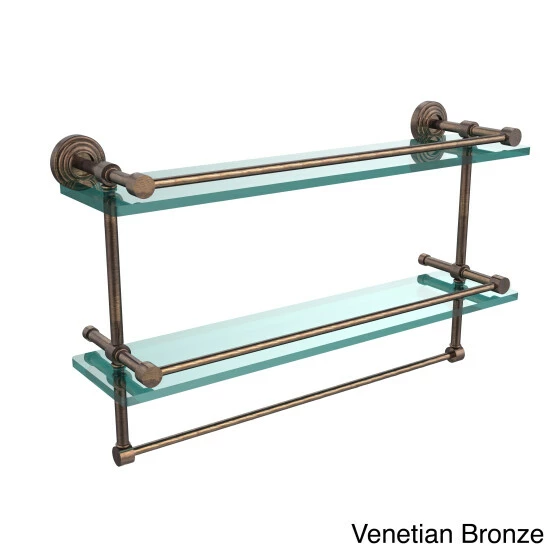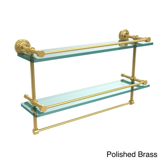 Add a flare of style to your decor with this decorative glass shelf. Shelf can be used anywhere in the home for a great space to store your products. Gallery rail will keep your items secure while the integrated towel bar provides a creative space for your towels. Tempered glass is .375 Inches thick and all of the hardware is made of solid brass and finished with the highest quality materials to provide a lifetime of beauty.